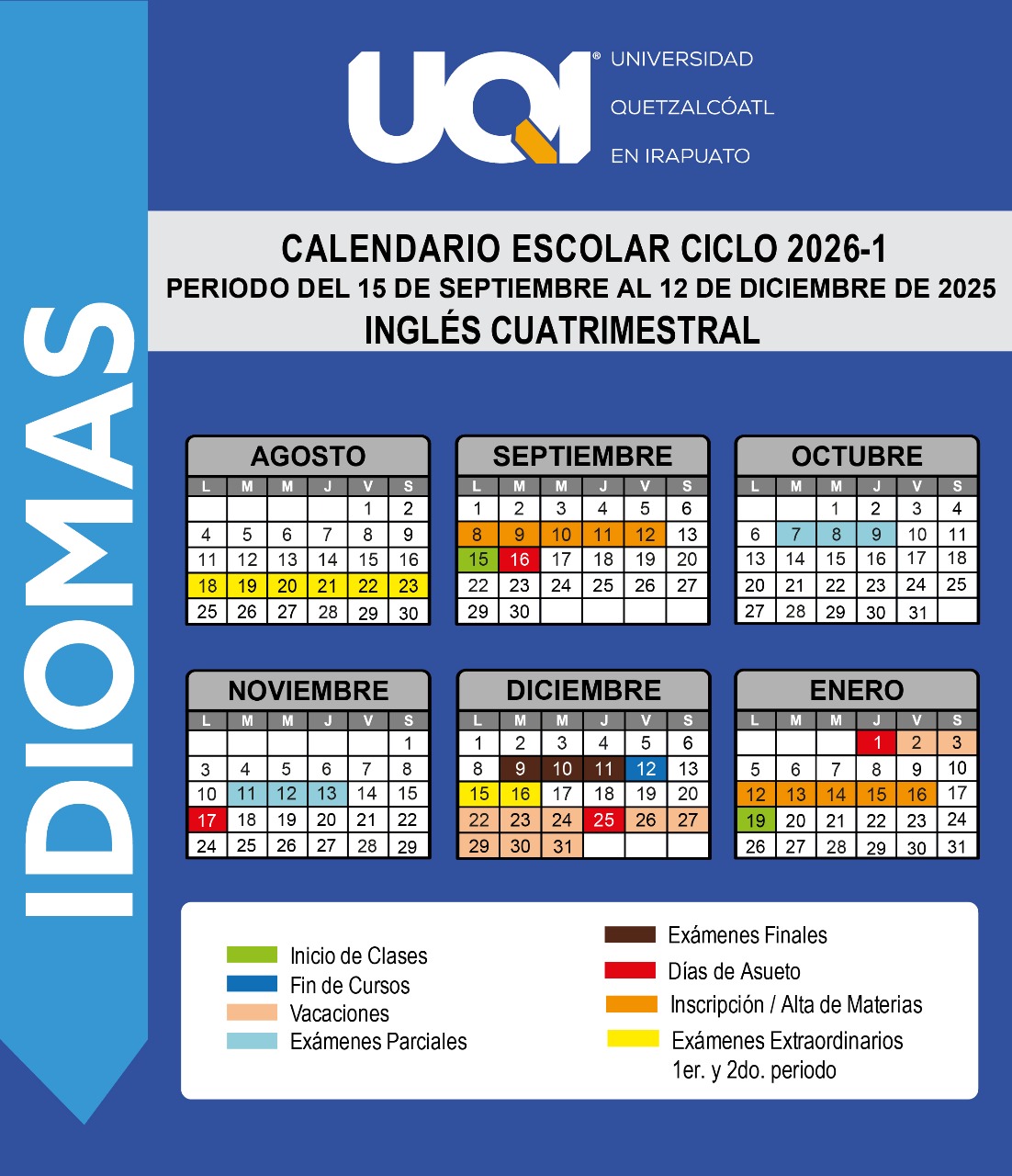 Además, a partir de agosto de 2025, ofreceremos clases de francés e italiano al público en general y a nuestros alumnos que ya hayan cumplido satisfactoriamente con el requisito de inglés para titulación, teniendo como objetivo en una primera etapa, que los alumnos lleguen a un nivel A2 de acuerdo con el Marco común Europeo de referencia para las lenguas, el cual indica que la